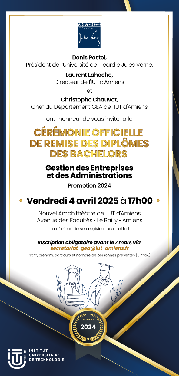 Le département Gestion des Entreprises et des Administrations de l'IUT d'Amiens est heureux de convier les diplômés de la promo 2023/2024 à sa cérémonie de remise des diplômes, qui aura lieu le vendredi 4 avril 2025 dans ses locaux en présence de :
