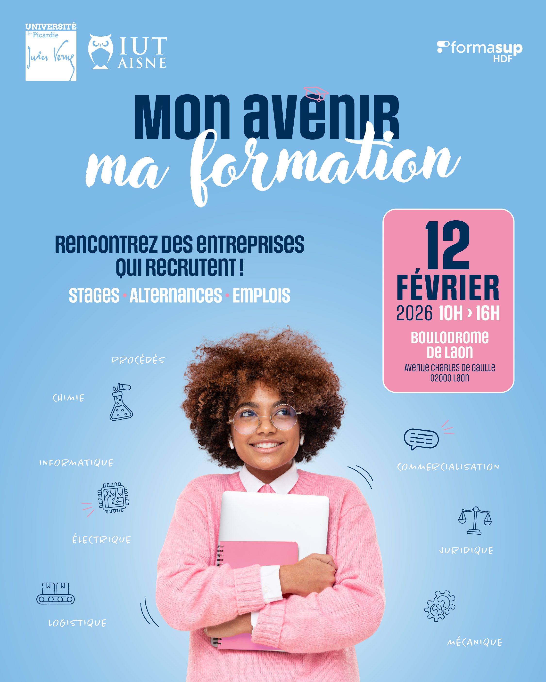 L’IUT de l’Aisne porte son premier salon dédié aux stages, à l’alternance et au premier emploi le 12 février 2026 de 10h00 à 16h00 au Boulodrome de Laon. L’objectif est de faciliter l’insertion professionnelle des étudiants.
